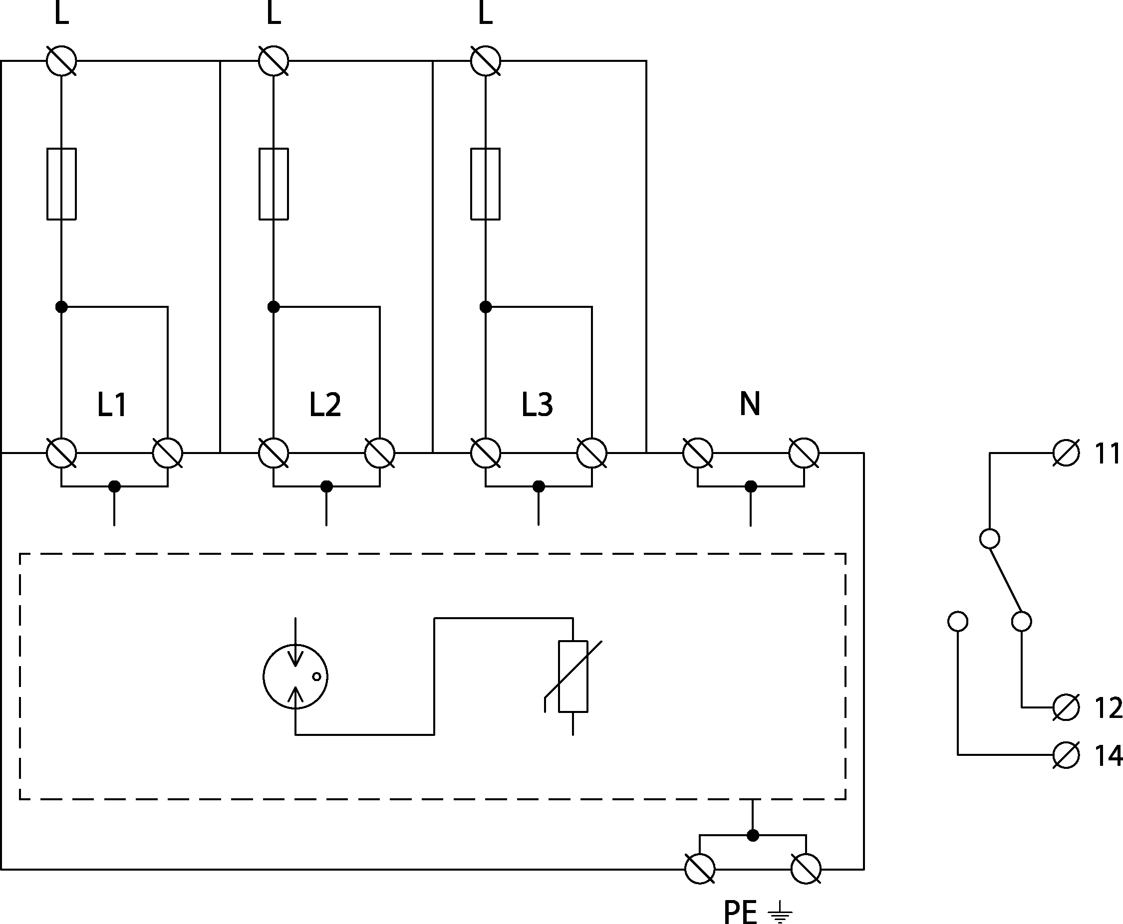 - combination of three-pole high performance lightning current arrester and encapsulated efficiency spark gap, connected in the 3+1 modeinstallation at the boundary of zones LPZ 0 and LPZ 1 or higher, mainly to main distribution boards