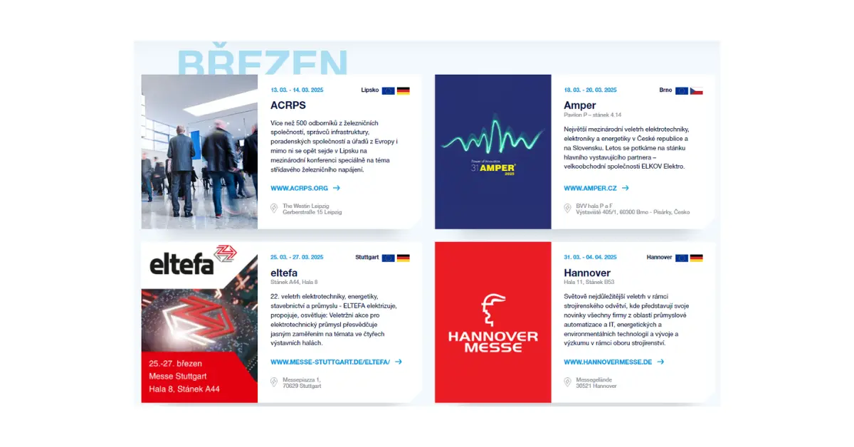 Měsíc začneme na tradiční konferenci odborníků na železnice ACRPS v Lipsku, pak se přesuneme do Brna, kde na stánku hlavního partnera výstavy společnosti ELKOV vystavíme naše novinky a řešení. A konec měsíce opět v Německu. Nejdříve s naším partnerem společností E.P.S. na výstavě ve Stuttgartu a pak hned na Hannover - velkolepý veletrh, kde představíme nový výrobek pro německý trh. Těšíme se na vás.