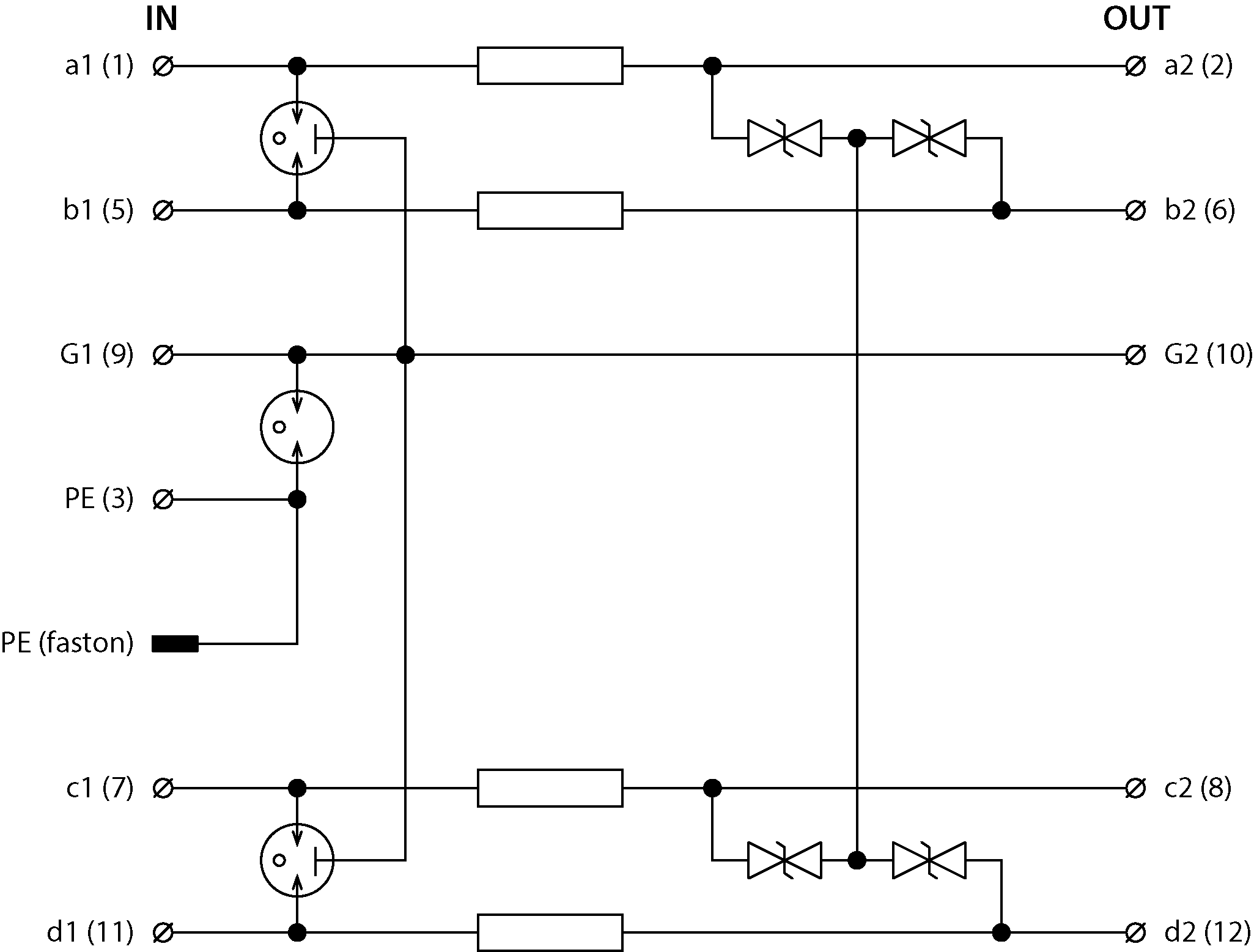 - proti podélnému přepětí (linka – ochranná zem) hrubá ochrana, proti příčnému přepětí (žíla – žíla) hrubá i jemná přepěťová ochrana a (žíla – GND) hrubá ochrana