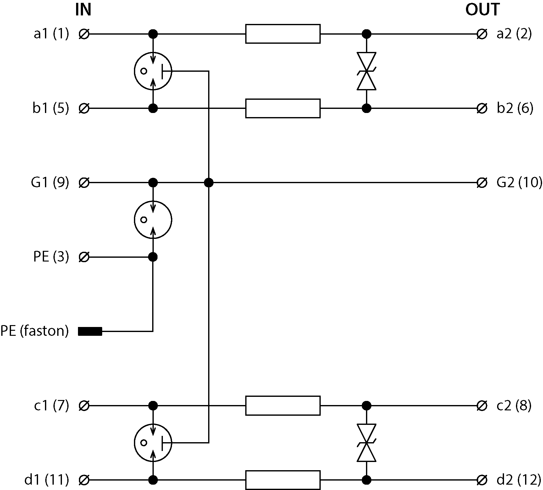 - proti podélnému přepětí (linka -ochranná zem) hrubá ochrana, proti příčnému přepětí (žíla – žíla) hrubá i jemná přepěťová ochrana a (žíla – GND) hrubá ochrana