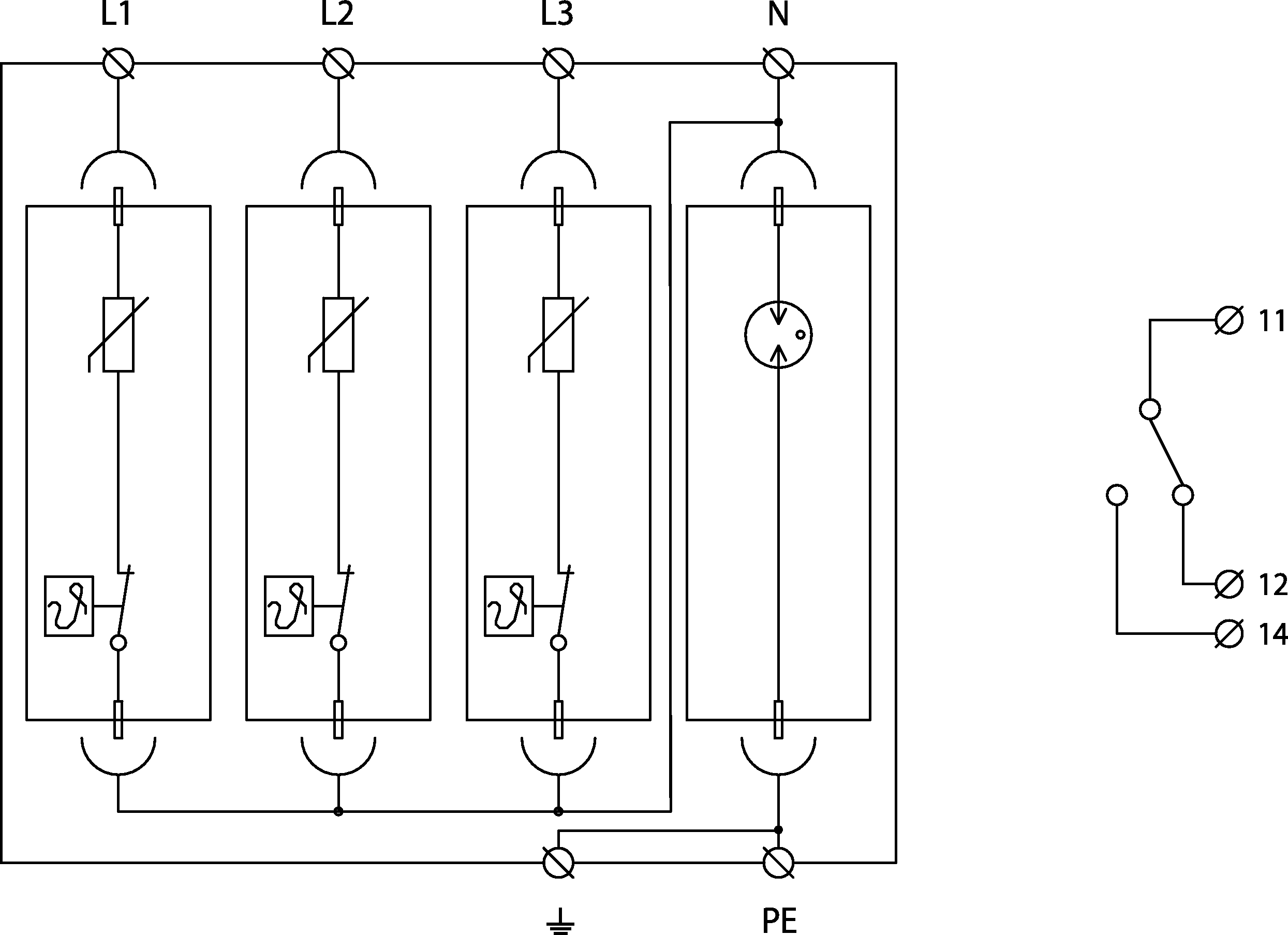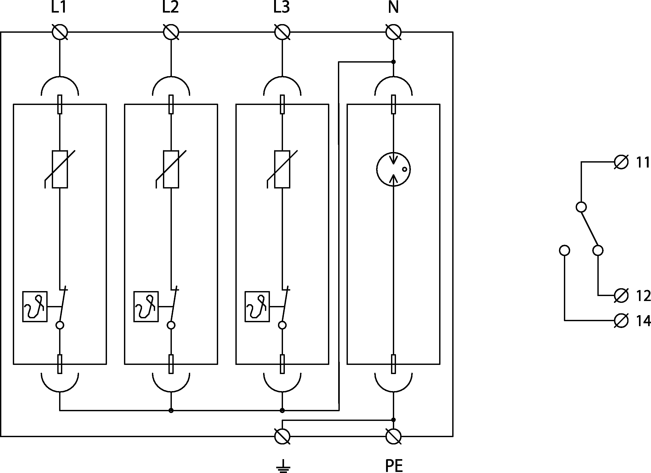 - sestava trojpólové varistorové přepěťové ochrany a uzavřeného jiskřiště zapojených v módu 3+1