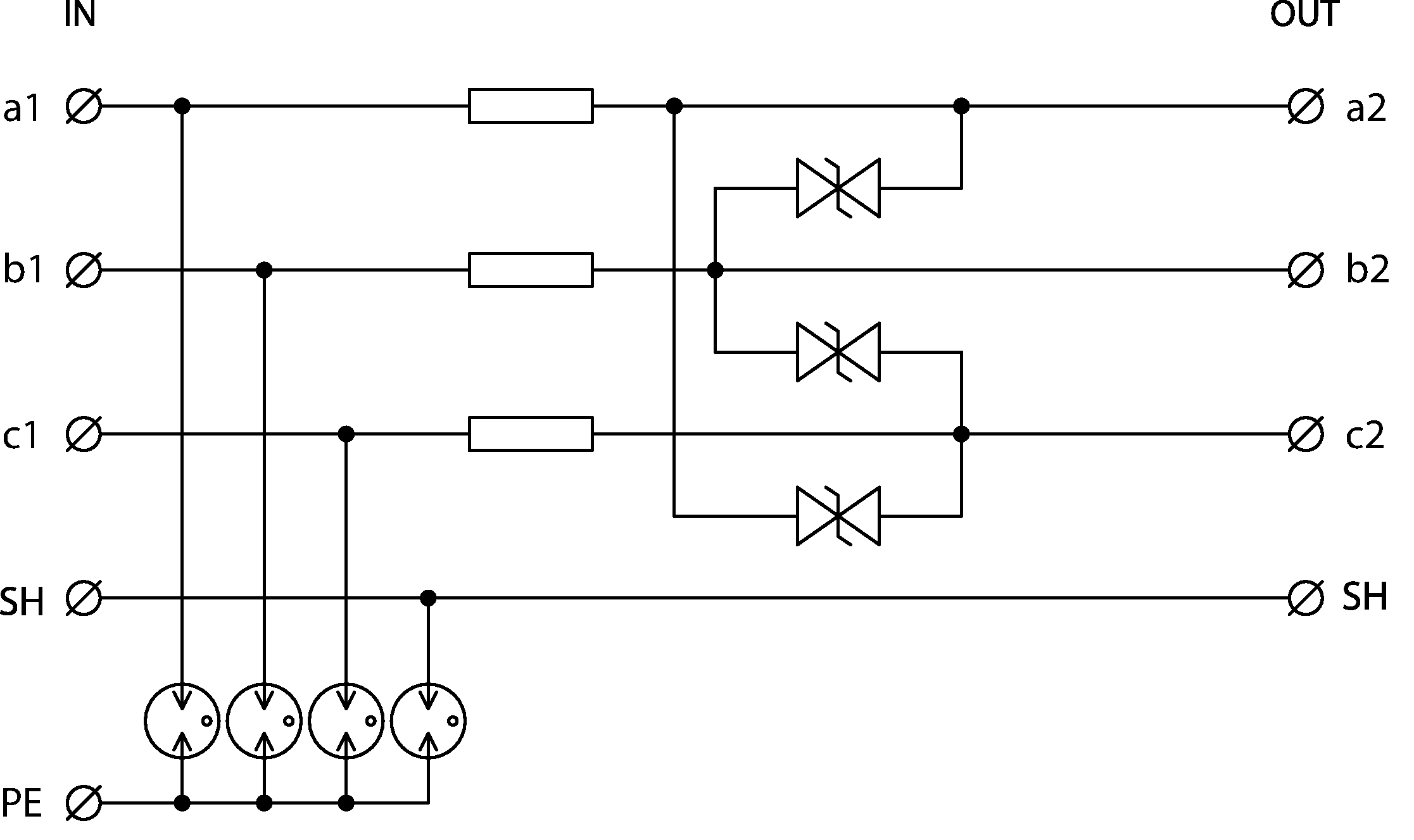 - proti podélnému přepětí (žíla–ochranná zem) hrubá přepěťová ochrana, proti příčnému přepětí (žíla – žíla) hrubá i jemná přepěťová ochrana