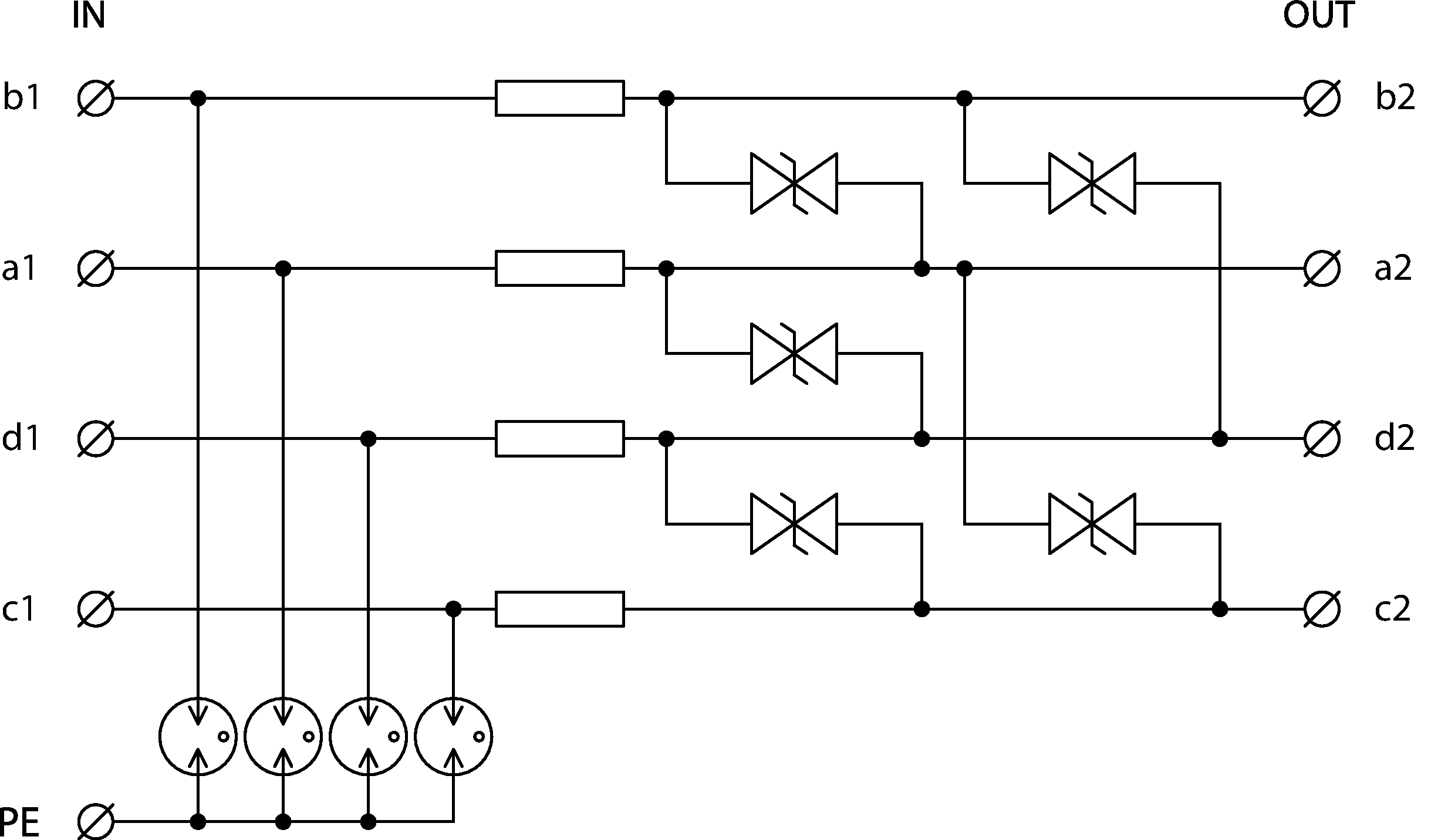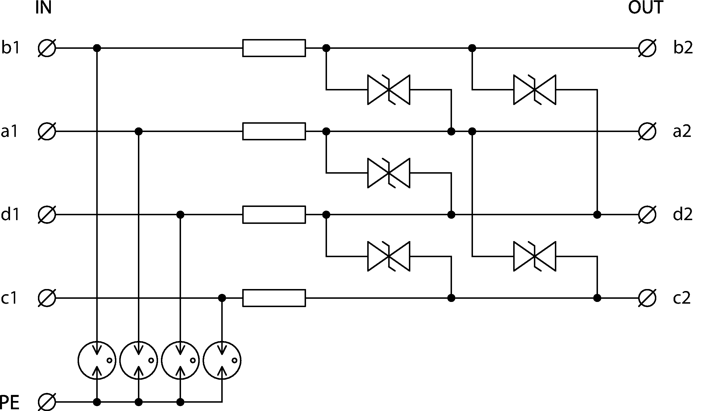 - proti podélnému přepětí (žíla–ochranná zem) hrubá přepěťová ochrana, proti příčnému přepětí (žíla – žíla) hrubá i jemná přepěťová ochrana