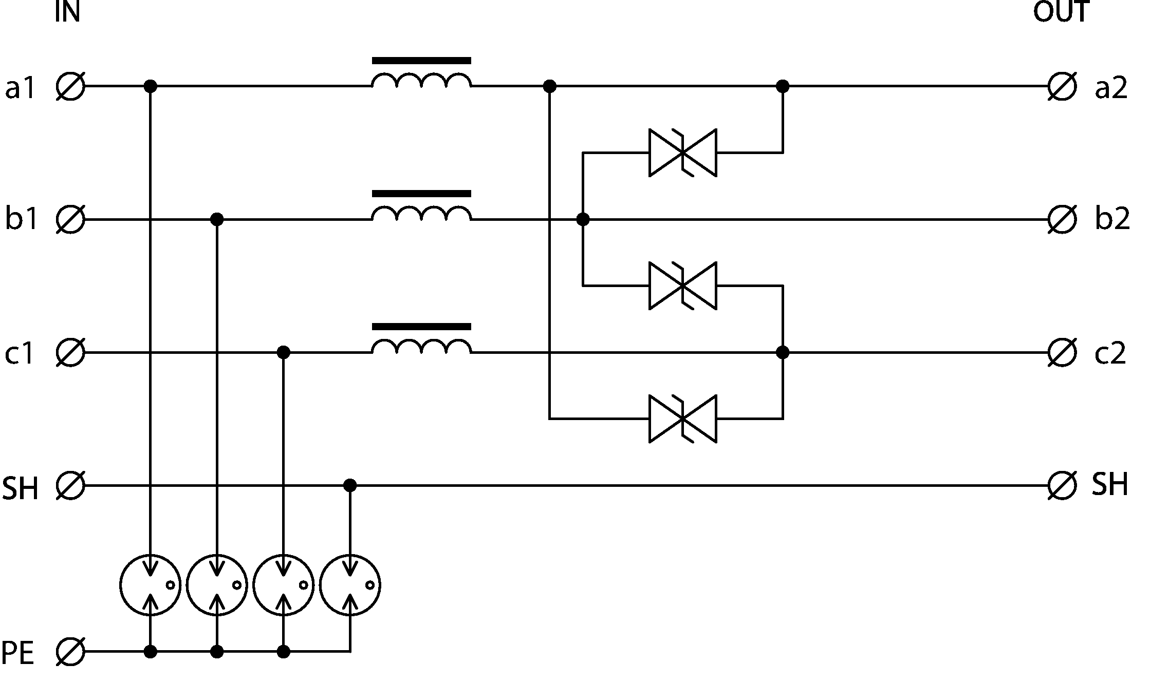 - proti podélnému přepětí (žíla–ochranná zem) hrubá přepěťová ochrana, proti příčnému přepětí (žíla – žíla) hrubá i jemná přepěťová ochrana