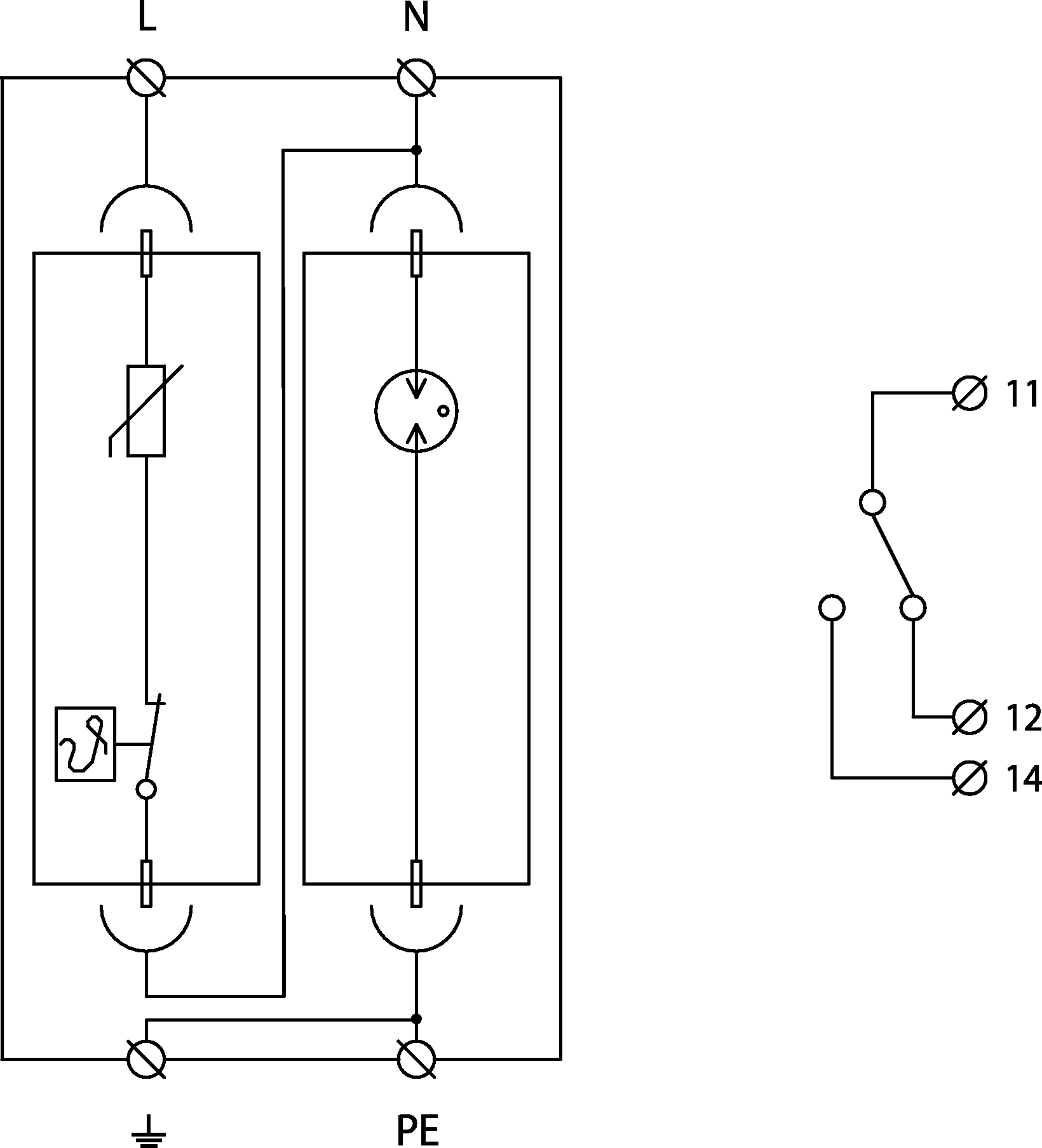 - varistorový svodič bleskových proudů s uzavřeným výkonným jiskřištěm zapojeným v módu 1+1