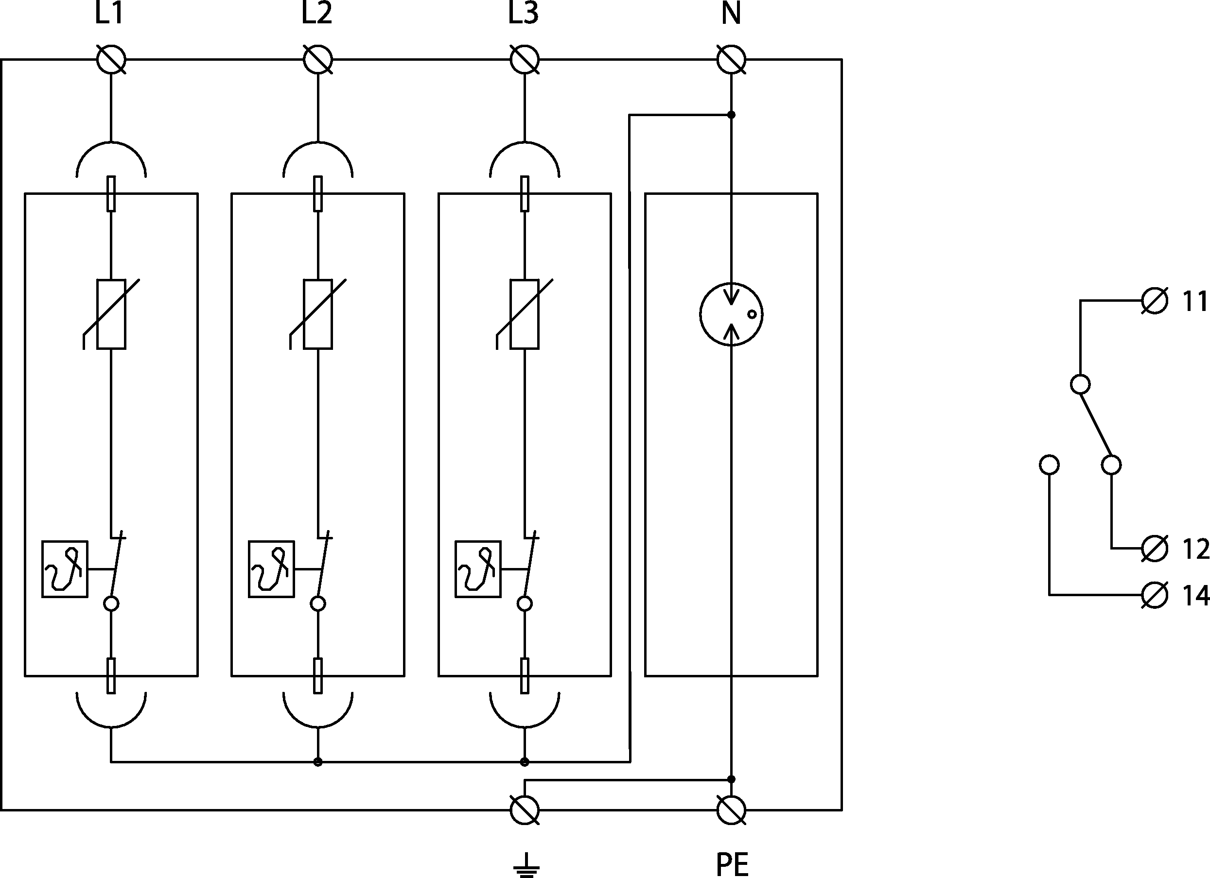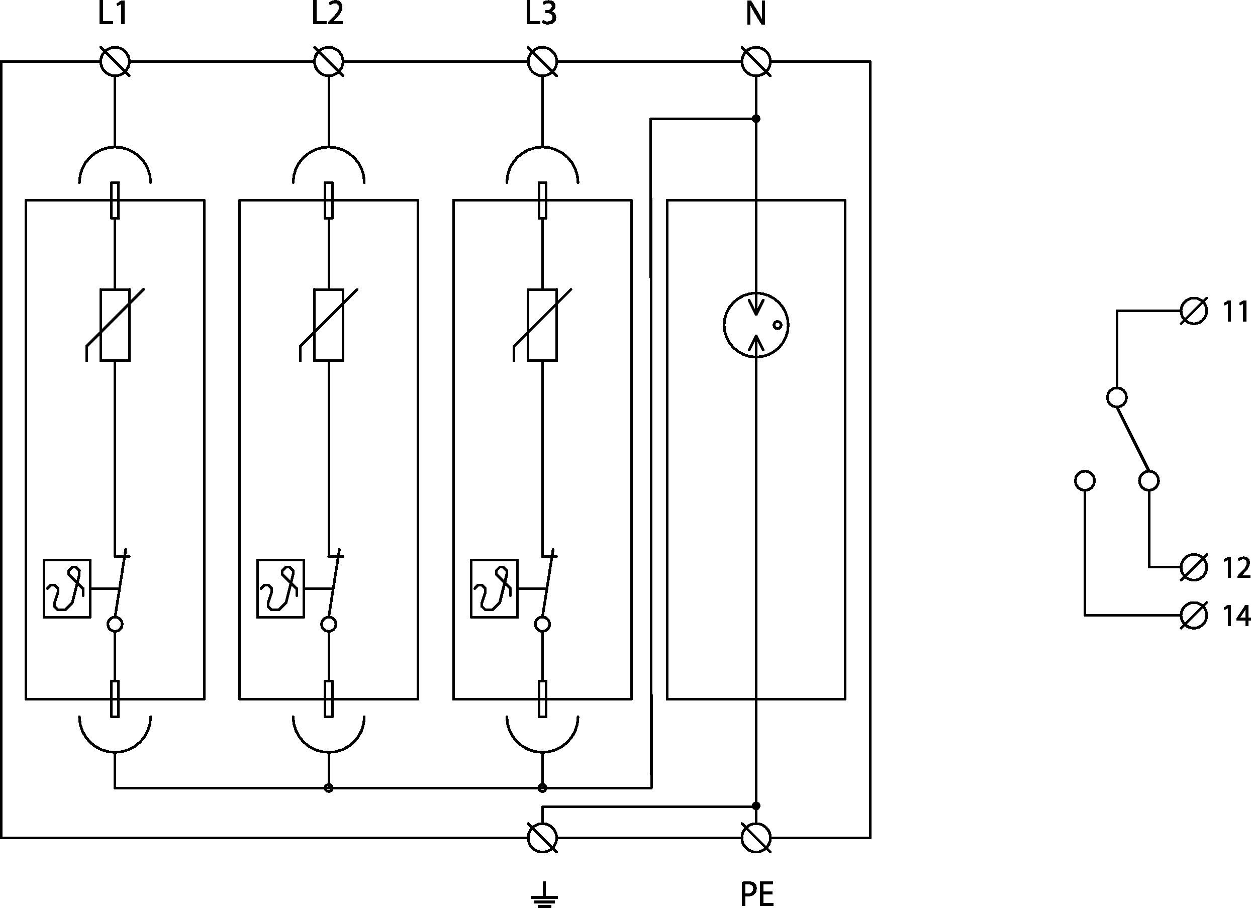 - sestava třípólového varistorového svodiče bleskových proudů a zavřeného výkonného jiskřiště zapojených v módu 3+1