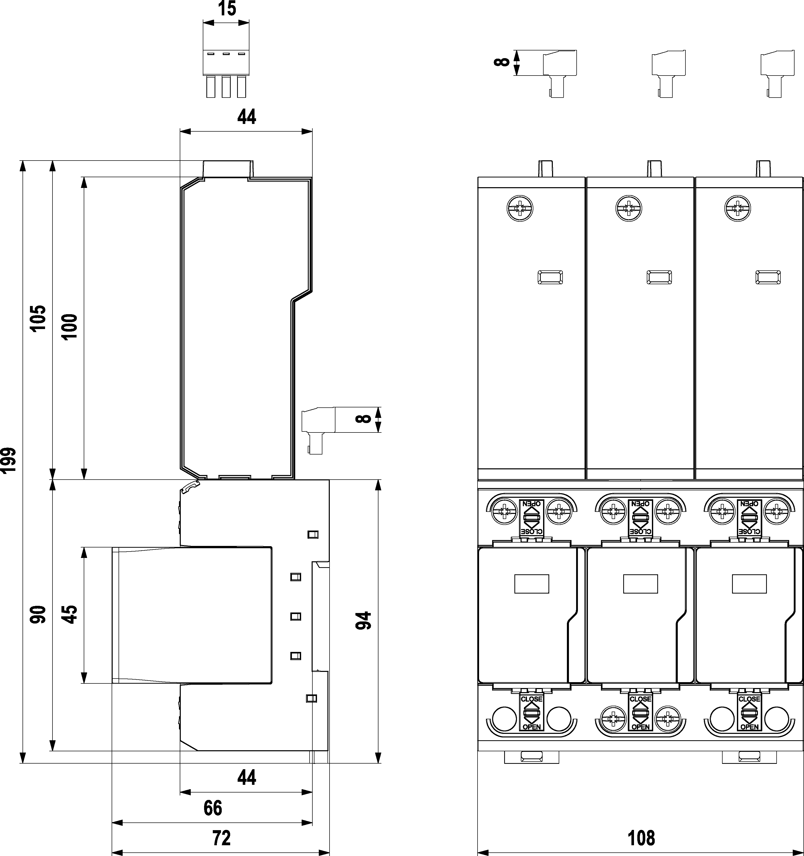 • třípólový výkonný kombinovaný svodič bleskových proudů