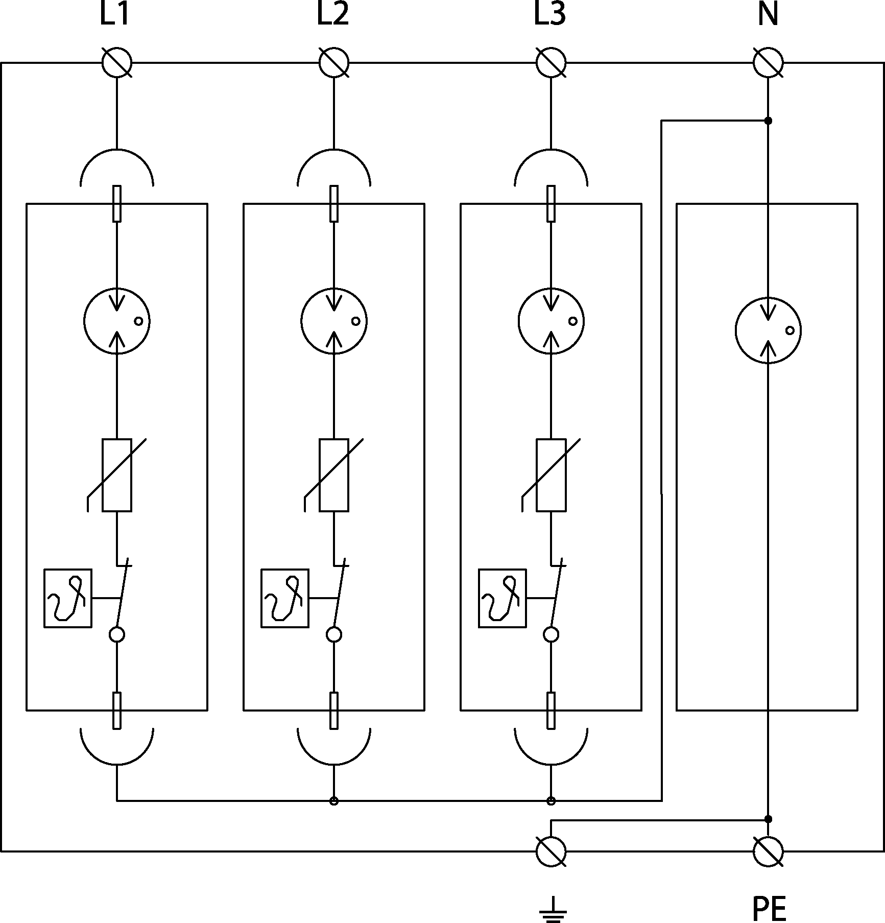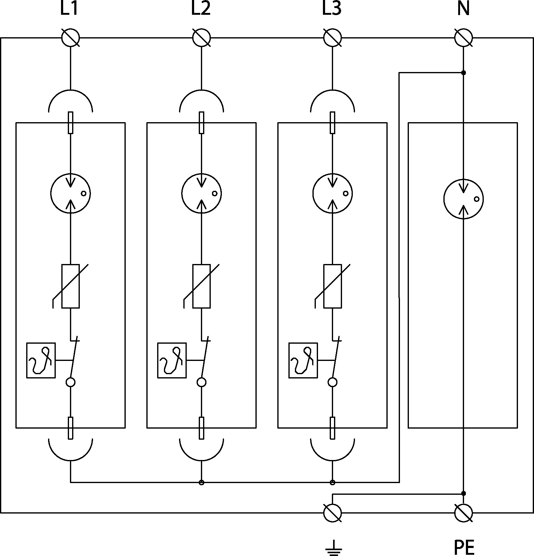 - sestava trojpólového kombinovaného svodiče přepětí (varistor se sériově zapojeným uzavřeným jiskřištěm) a uzavřeného jiskřiště zapojených v módu 3+1